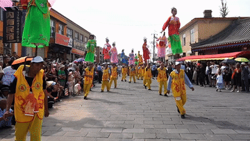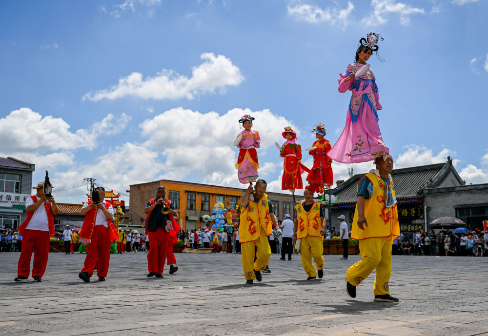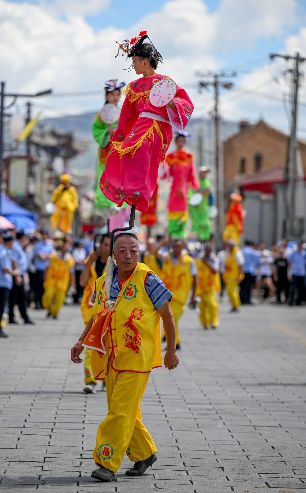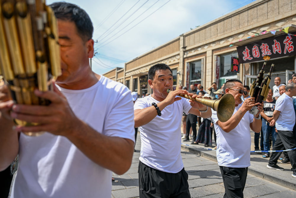 7月27日,六月二十二,乐队的乐手们在当日的巡街文艺表演中卖力吹奏。