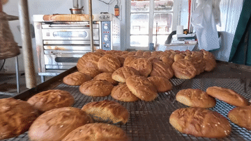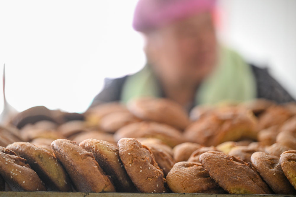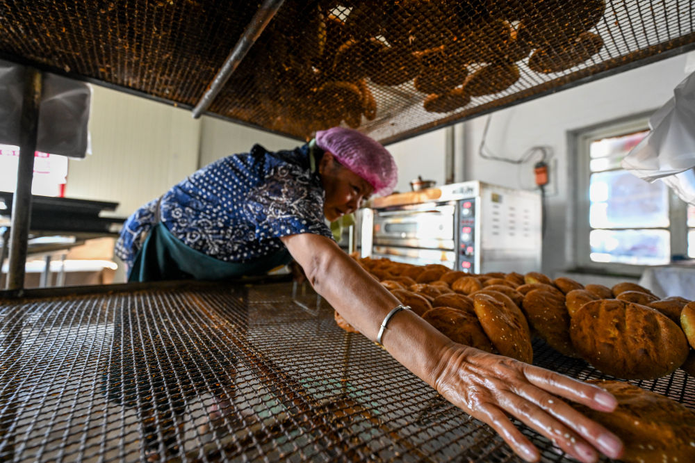 7月26日,在隆盛庄常三文月饼店,常三文的妻子码放刚出炉的丰镇月饼。常三文是内蒙古自治区级非物质文化遗产项目“隆盛庄月饼制作技艺”的第四代传人。