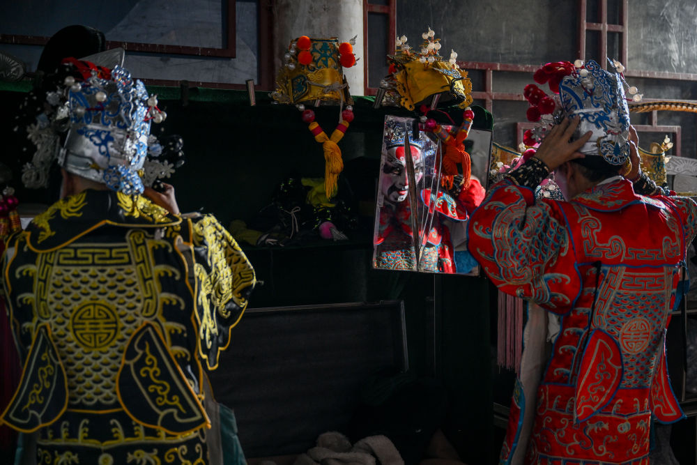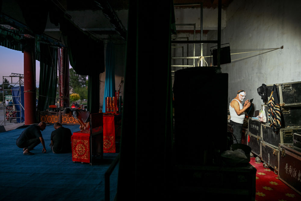 7月26日晚,当地邀请的晋剧曲艺团准备唱大戏,演员和工作人员们忙着化妆和整理戏台。