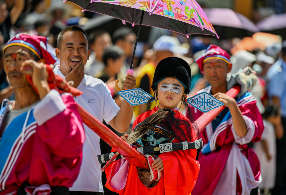 7月25日,庙会游行队伍中的“穿心官”项目。