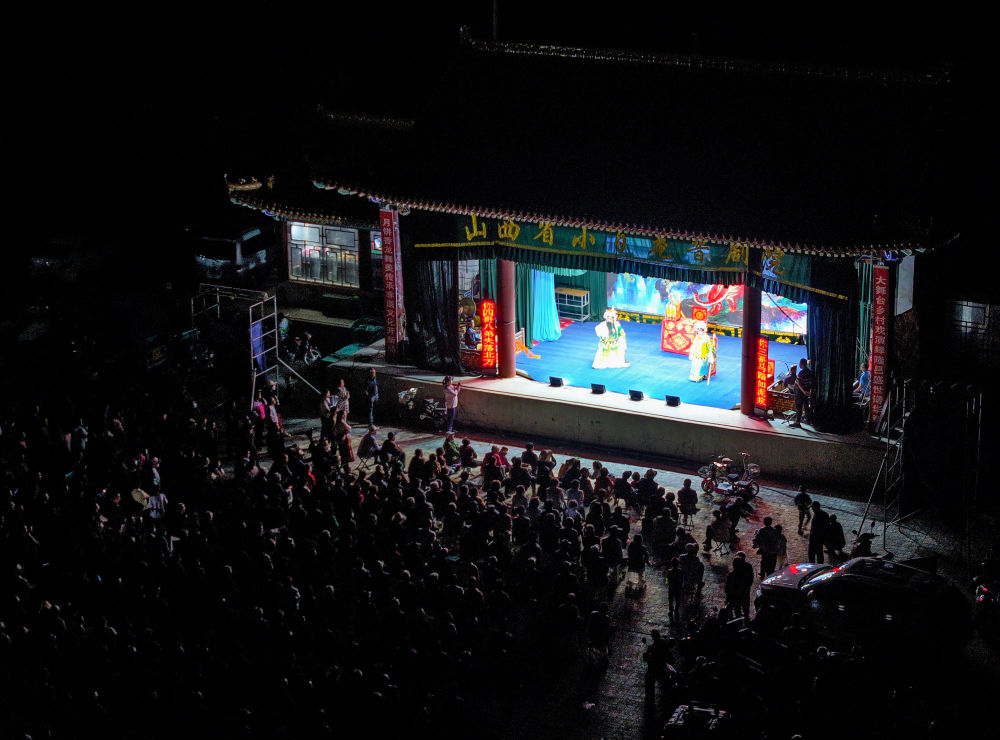 7月26日,作为庙会活动的一部分,当地邀请的晋剧曲艺团在晚上唱起大戏,吸引力大量群众前来听戏(无人机照片)。