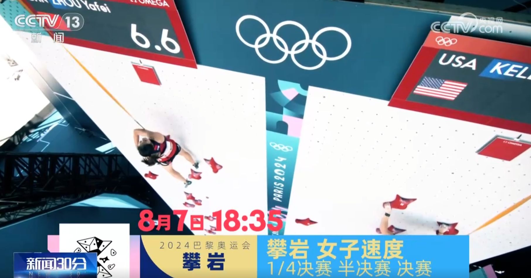 另外,十八点三十五分,攀岩项目将进行女子速度赛四分之一决赛、半决赛和决赛。两名中国选手周娅菲和邓丽娟都以创造个人最好成绩的表现晋级8月7日的比赛。
