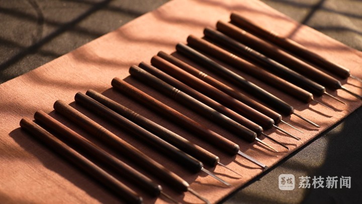 选料考验的是眼力,设计追求的是思路,微雕要的更是精湛技艺。光福核雕属南派核雕的一种,技巧上以浮雕、圆雕、透雕为主。在布局结构方面,光福核雕保留了使用刻刀的传统,但刀工技法相较于其他流派更加细腻精巧,从修核画线到精雕打磨,每一步都要求精确和细致。“以前做木雕的刀很大,一下子换成这么小的橄榄核,人物的五官三庭五眼很难把控,我真的无从下手。”周建明便从基础刀工开始,手把手地教授竹鑫尧雕刻技巧。