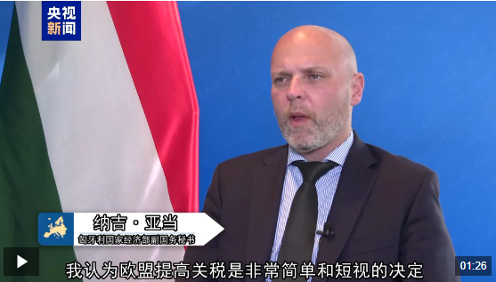 匈牙利国家经济部工业事务副国务秘书 纳吉·亚当:我认为欧盟提高关税是非常简单和短视的决定,这意味着他们只是将竞争性业务界定在2025年和2026年,欧盟和中国的电动汽车价格将相同,这样可以让人们和公司都来买欧盟的电动车,但是从长远来看,这对每个消费者购买什么类型的电动汽车毫无益处,因为它仍然比我们使用的传统汽车贵得多。从短期来看,此举意味着,过去几年乃至几十年全球贸易的发展将出现倒退。从长期来看,此举将造成中欧之间贸易紧张局势,甚至可能会导致贸易冷战。