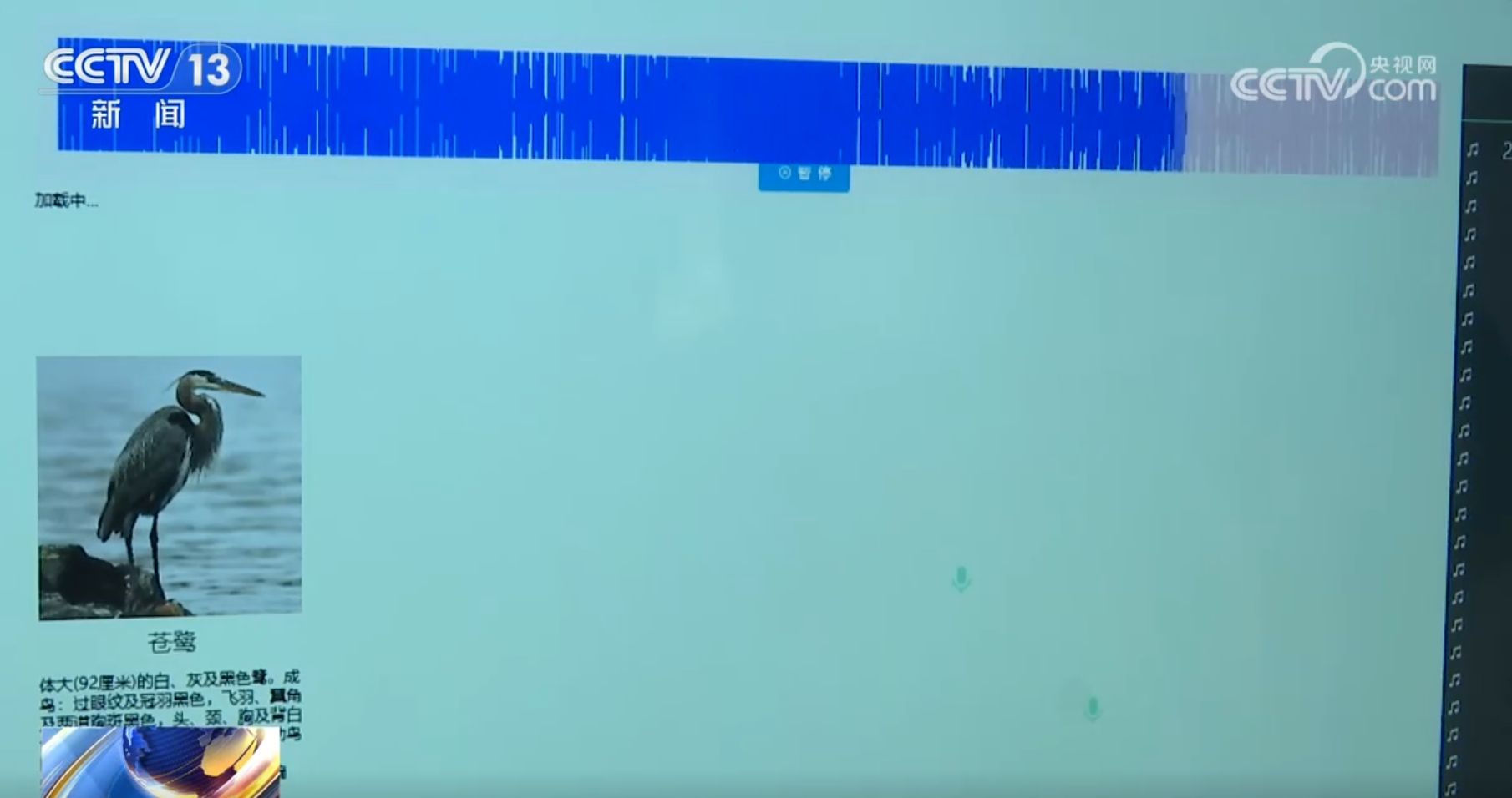 这是设备捕捉到的一段鸟叫声,通过声纹图谱识别系统确认这是一只苍鹭。