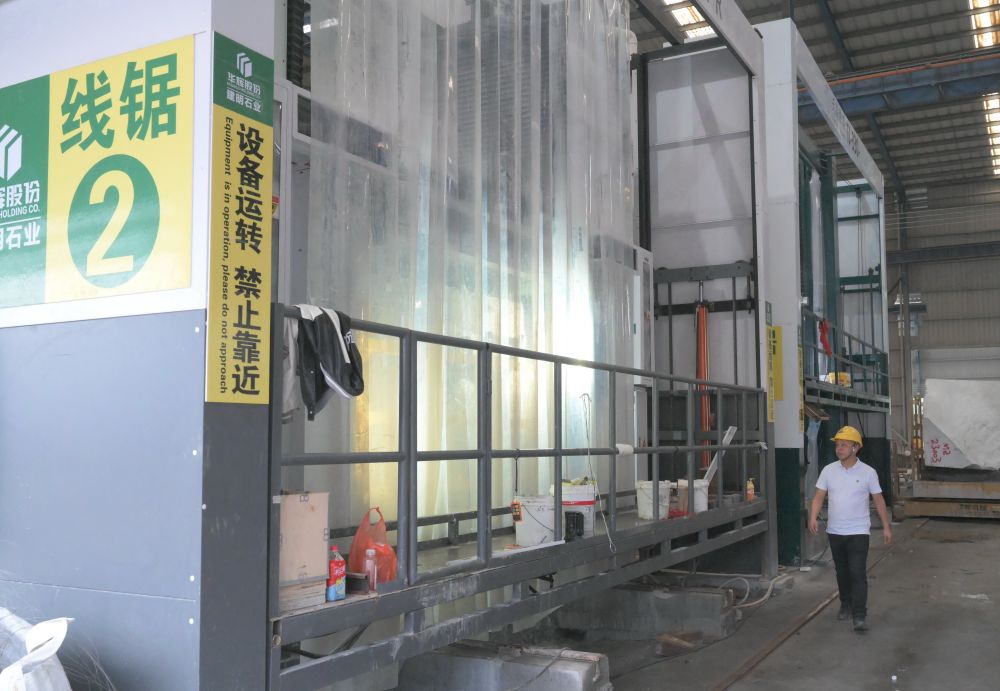 4月30日,在福建省华辉石业股份有限公司石材生产车间拍摄的线锯设备作业现场。新华社记者 林善传 摄