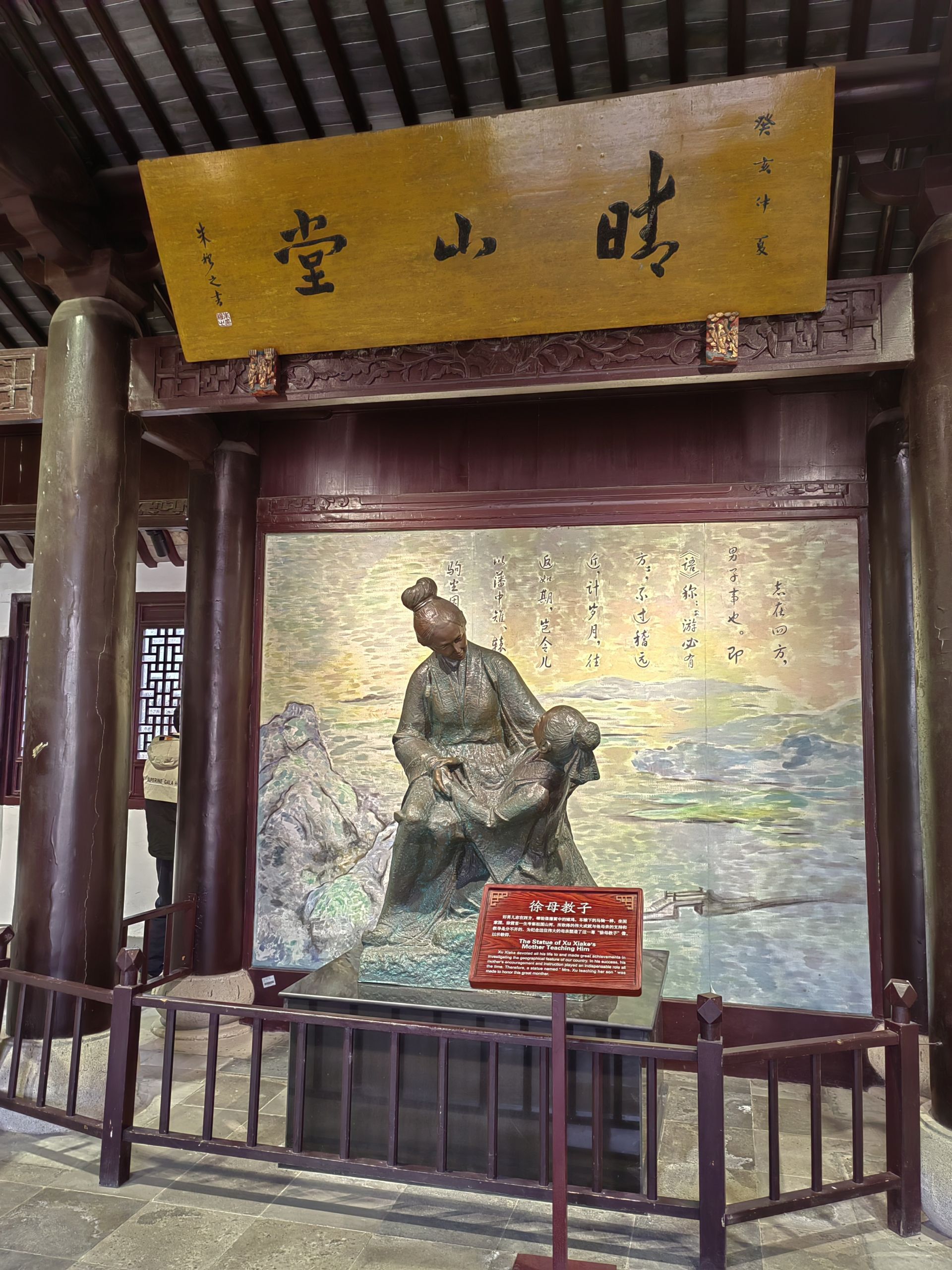 晴山堂位于徐霞客故居西南方向,圣塘河以南。唐汉章介绍,徐霞客所建的晴山堂早已经被毁,1978年进行了重建。这是一栋硬山顶仿明建筑。堂内正中是“徐母教子”雕塑,反映了徐母对他的谆谆教诲,以及徐霞客对母亲的赤子情深。晴山堂两侧墙壁上镶嵌着劫后余生的“晴山堂石刻”,共计76方,其中最早的元末明初著名画家倪云林于明洪武三年题写的“本中书屋图”,最晚的是崇祯六年的“秋圃晨机为徐孺人赋并赠霞客北游”,时间跨度达262年。
