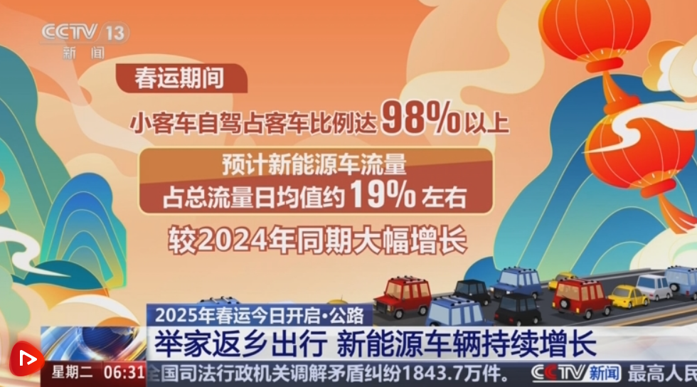 春运期间,举家返乡出行多,小客车自驾成为主流,占客车比例达98%以上,其中新能源车辆持续增长。预计春运期间新能源车流量占总流量的日均值约19%左右,较2024年同期大幅增长。
