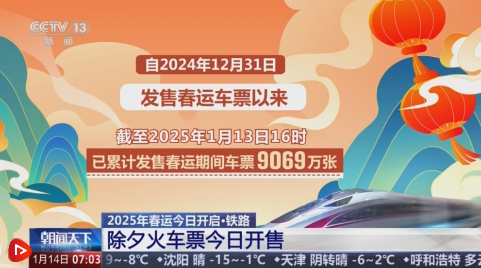 记者从铁路12306科创中心了解到,自2024年12月31日开始发售春运车票以来,截至13日16时,已累计发售春运期间车票9069万张。此外,铁路部门根据12306预售票和候补购票数据,将在条件允许的热门方向和时段加大运力资源投放。
