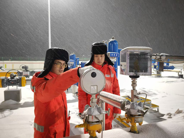 黑河作业区员工夜间对天然气管道进行巡检。受访者供图