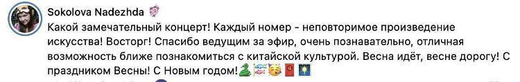 俄罗斯网友哈桑·哈姆里留言:“多么精彩的文艺晚会!每一个节目都是一件独特的艺术品!感谢俄语主持人(伴随式)直播,非常有帮助,这是更深入了解中国文化的好机会。春天来了,春节快乐!新年快乐!”