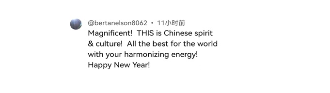 优兔网友bertanelson8062在观看了武术《笔走龙蛇》后留言:“太精彩了!这正是中国的精神与文化!愿你们和谐的活力为世界带来最美好的祝福!新年快乐!”