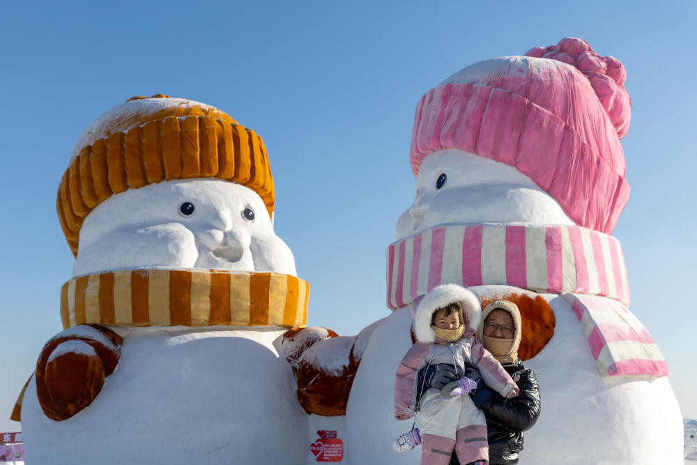 2025年1月15日,游客和市民在哈尔滨松花江畔的大雪人前游览。