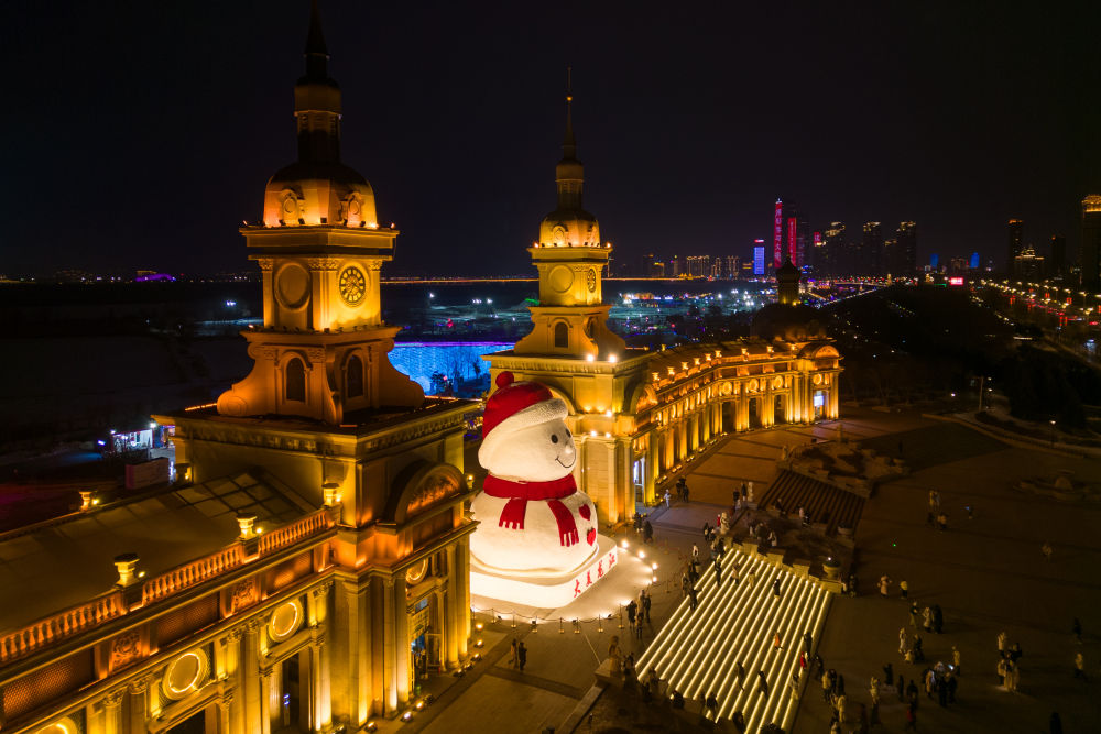 2025年1月12日,哈尔滨冰雪大世界园区上演音乐“快闪”,为即将到来的亚冬会助力。
