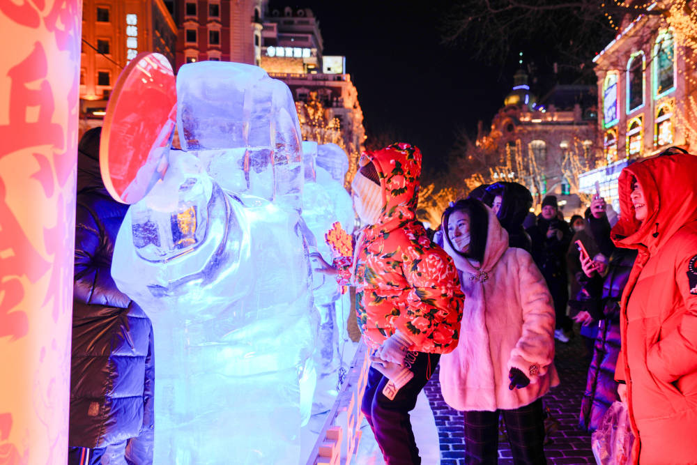 2025年1月30日,小朋友在哈尔滨中央大街上用手感受冰雕的温度。
