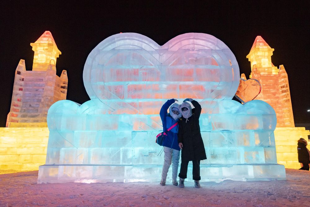 2021年12月25日,游客在哈尔滨冰雪大世界园区游玩拍照。