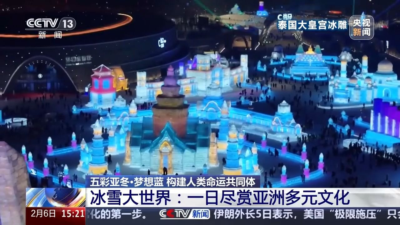 总台央视记者 赵晶:夜晚的冰雪大世界呈现出五光十色的美丽景象,在这里有一座名为“亚洲同心”的主塔,它不仅是一座凝固的冰雕建筑,也是亚洲团结、梦想与希望的象征。哈尔滨冰雪大世界也是哈尔滨亚冬会开幕式的分会场,让我们一同期待在这里的特别呈现。