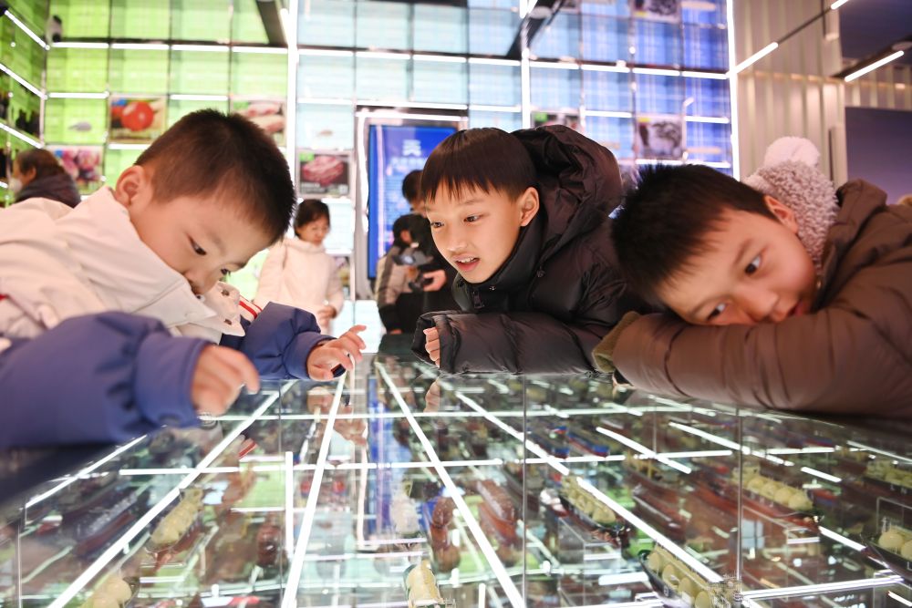 2月12日,小朋友在“津港印象”文旅综合体验馆了解船舶模型。新华社记者李然 摄