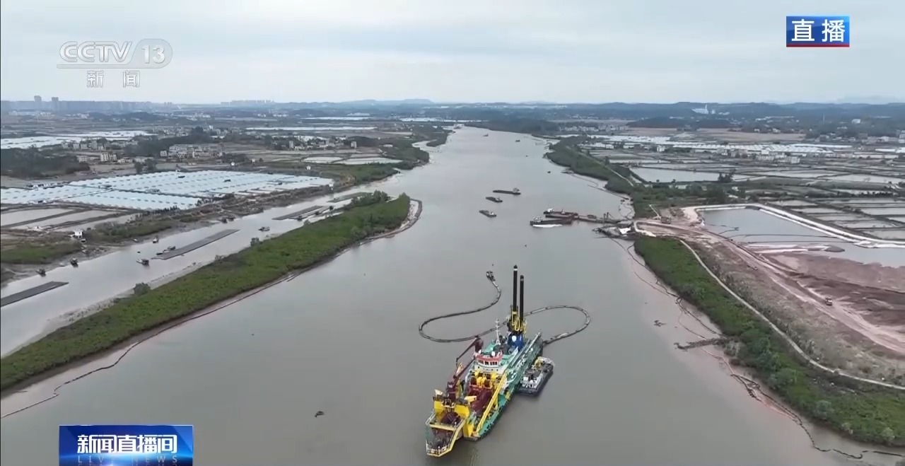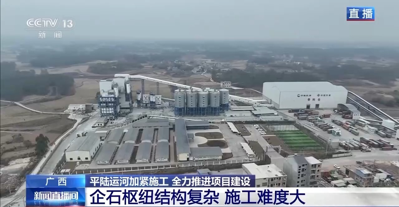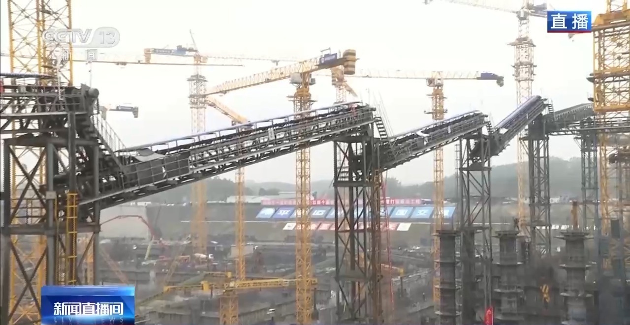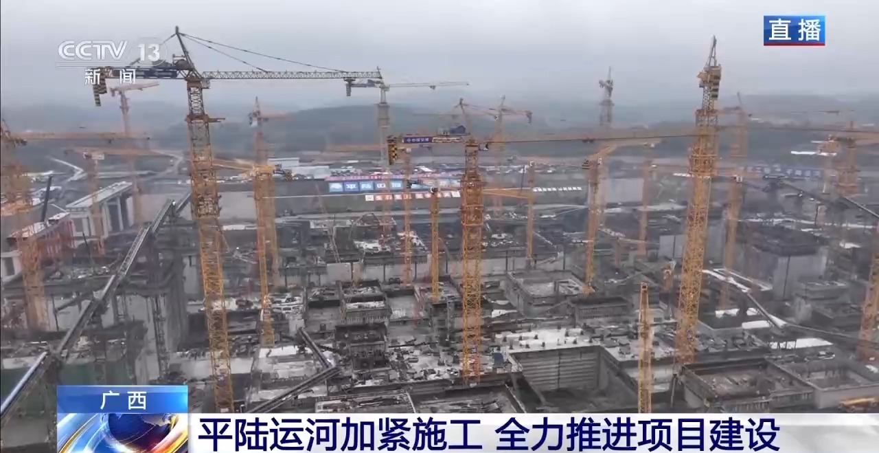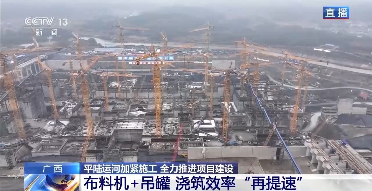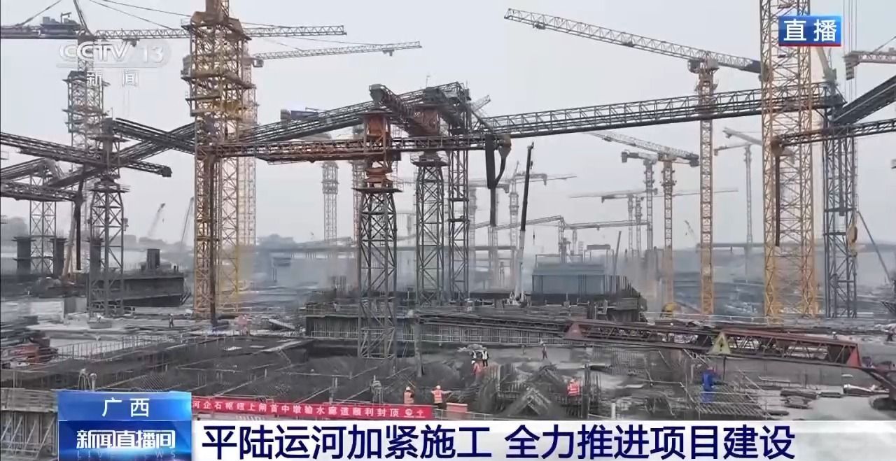 总台记者廖汨:我正在平陆运河第二座梯级枢纽企石枢纽的建设现场。此时此刻,建设者们正在抓紧时间对船闸主体进行混凝土浇筑。