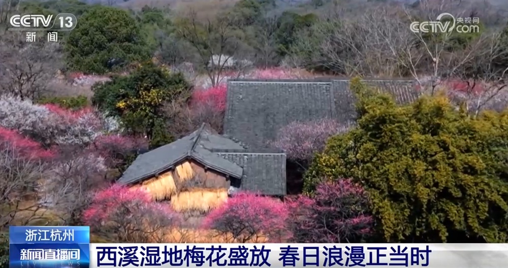这里是杭州西溪湿地,从空中俯瞰,300余亩梅花沿水岸蜿蜒伸展,如粉色烟霞笼罩湿地。江梅、绿萼、朱砂、宫粉等十余个品种次第开放,暗香浮动,与纵横的溪流、古朴的村落相映成趣,构成一幅流动的江南水墨画。