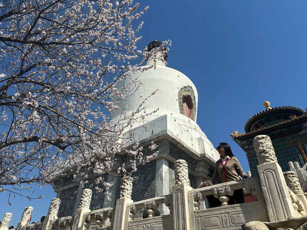 3月18日,游客在北京北海公园赏花游玩。新华社记者杨淑君 摄