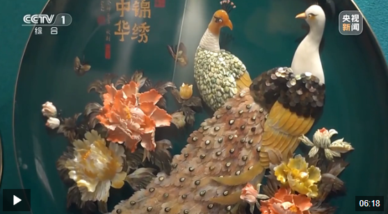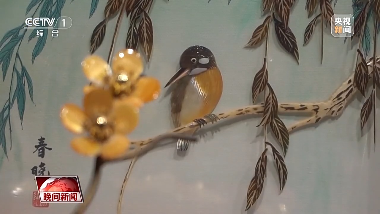 桂林电子科技大学设计与创意学院工艺美术系副主任 陈承洁:这一组作品的话,就是我们老师跟同学一起合作的作品叫《敦煌灯尚》,这个作品的话是获得了我们2019年首届中国工艺美术博览会“云鼎杯”的文创设计大赛的金奖。同时我们再看一下这边的作品,我们同学用非遗绒花跟非遗贝雕进行了一个融合的创新,以及我们后面的这一幅装饰画,它是用了蜡染加贝雕相结合的方式进行了材质的创新。