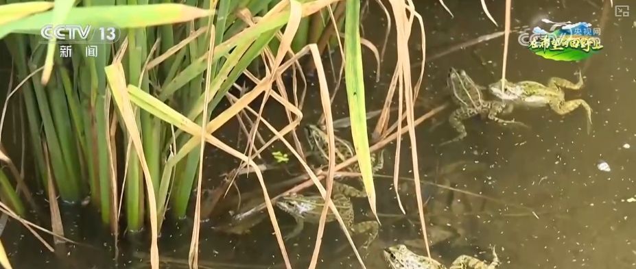 小鸭子们喜欢吃稻谷,它们会不会把稻田里的谷子也吃掉?为了防止这样的情况发生,这里采用的模式是“鸭蛙稻”模式,5月放鸭、7月放蛙,在水稻进入抽穗期,也就是有稻谷的时候,15万只小青蛙就会来接力管理这片农田,由它们来捕食害虫,替代杀虫剂。