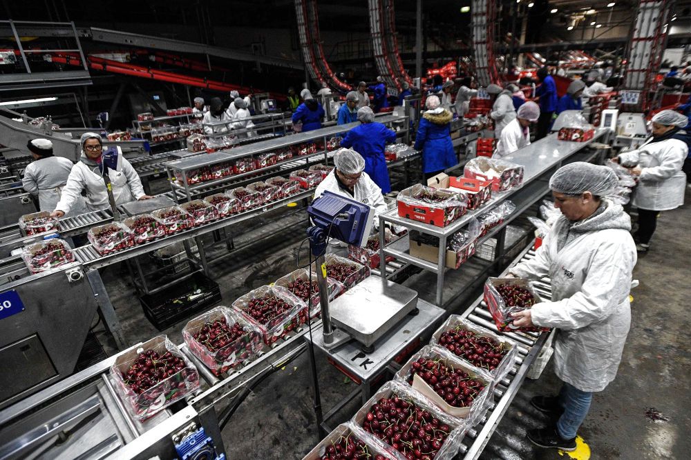 2024年12月13日,在智利莫斯塔萨尔的一座吉制公司工厂,工作人员处理车厘子。吉制公司2006年起开始向中国出口车厘子。新华社发(豪尔赫·比列加斯摄)