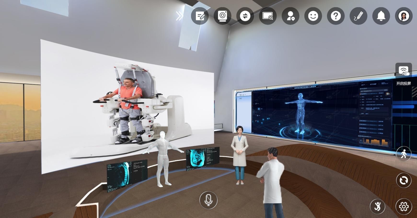 “就像推开一扇通往平行世界的门,这种‘在场感’是传统远程协作难以企及的。”维赛客首席运营官徐晨翔边演示边解释道。他调出了VS·work中的“智联康复元诊疗平台”——这是维赛客在医疗元宇宙领域的创新应用,集成了病情诊疗、康复训练、社交培训等功能。在虚拟界面中,医生可以通过高精度空间定位系统“走进”患者的虚拟诊疗室,患者则通过可穿戴设备完成肌力评估、平衡训练等动作,数据实时反馈至医生终端,为偏远地区的患者提供了更加便捷、高效的诊疗服务。