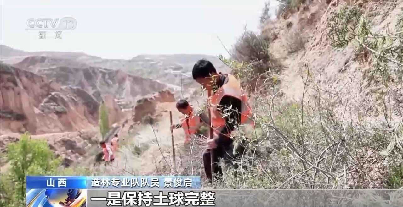 山西柳林县留誉河流域,山高坡陡,人在坡上行走十分困难,造林专业队的工人师傅们用无人机将一棵棵油松树苗精准地空运到植树队员手中。