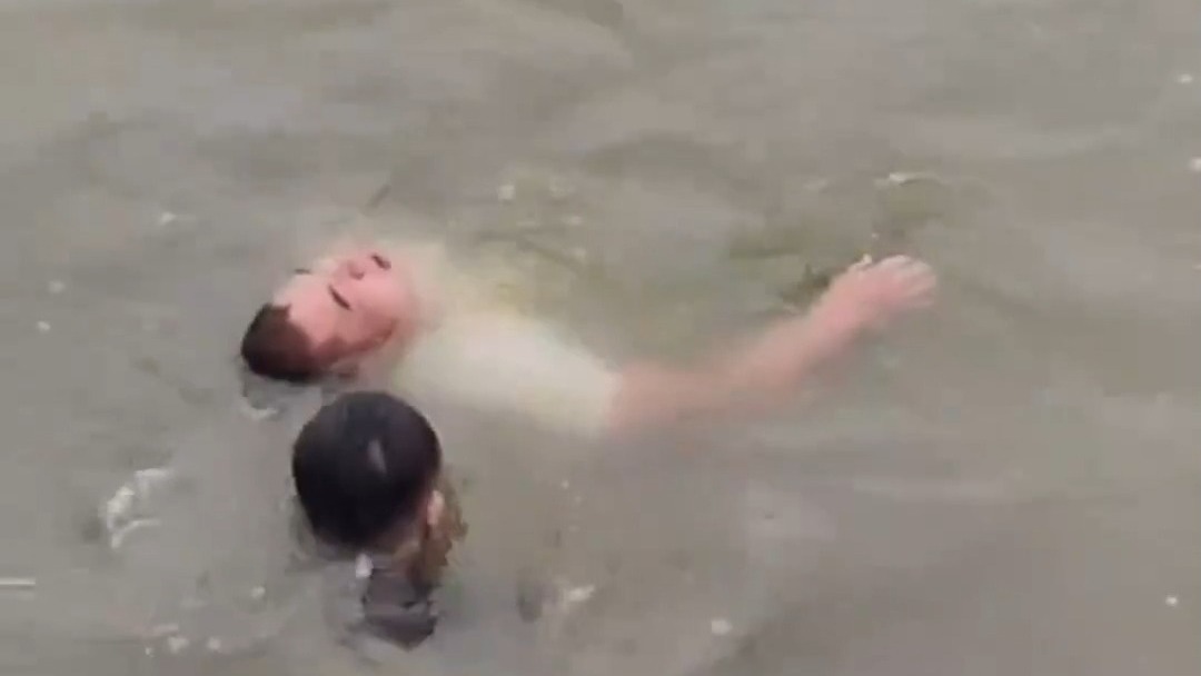在岸边哭喊着让他赶紧上岸