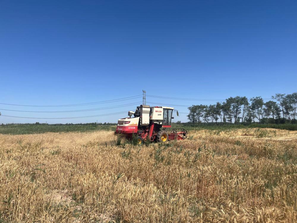 △收割机在山东武城县郝王庄镇的耐盐碱小麦试验示范基地里作业。