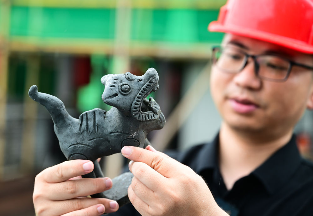 6月19日,周虎在歙县徽州古城南谯楼保养维护工程现场查看屋脊兽。