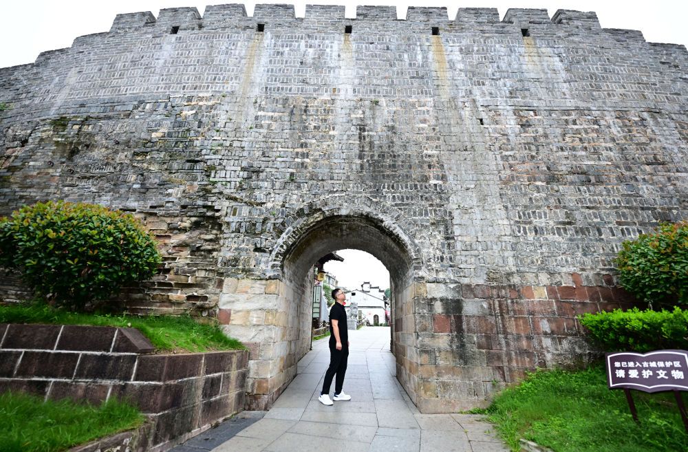 6月19日,周虎在歙县徽州古城城墙巡查。