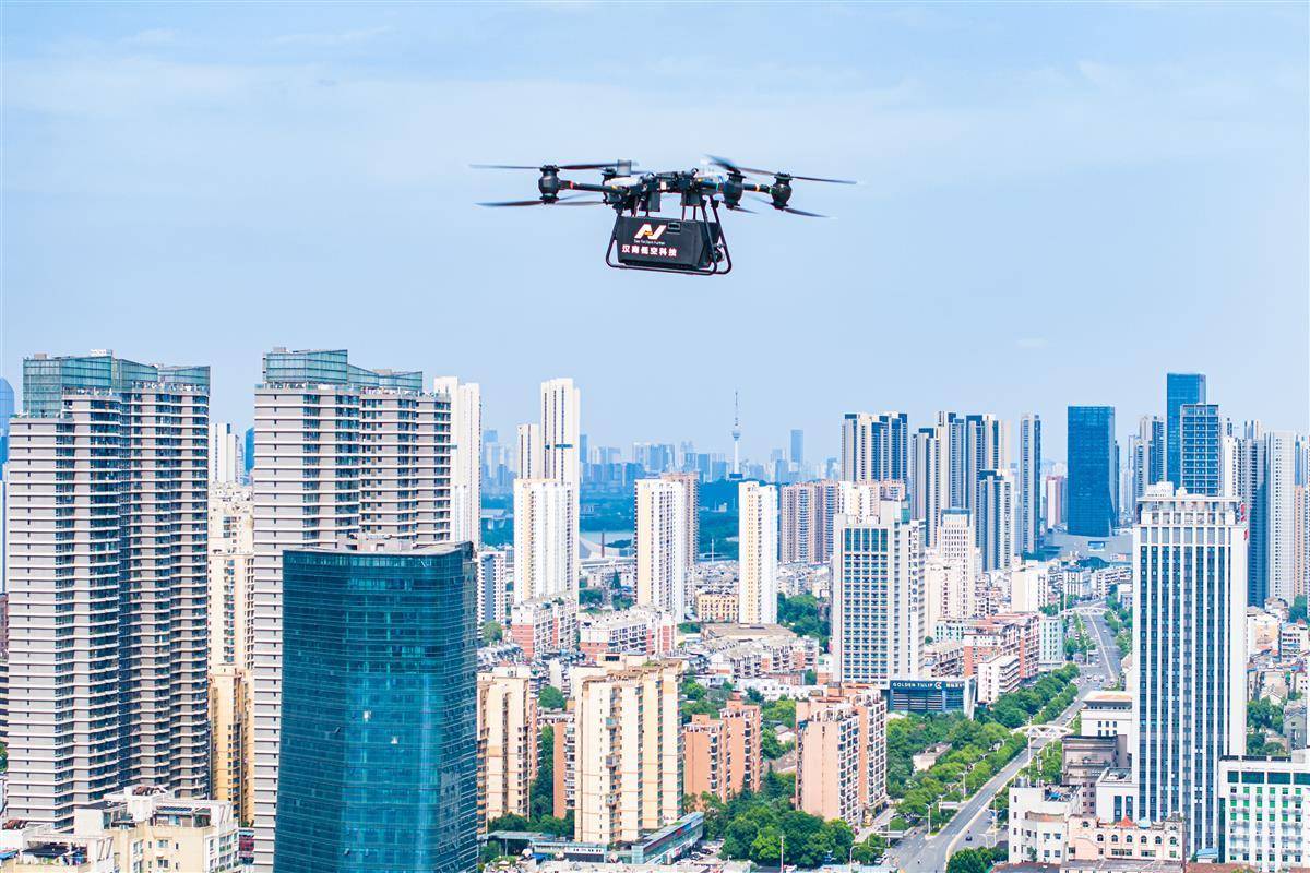 6月16日,载有龙虾、鲜花的无人机飞行在武汉城市上空,准备降落在汉商21世纪购物中心楼顶停机位。(湖北日报全媒记者 任勇 摄)