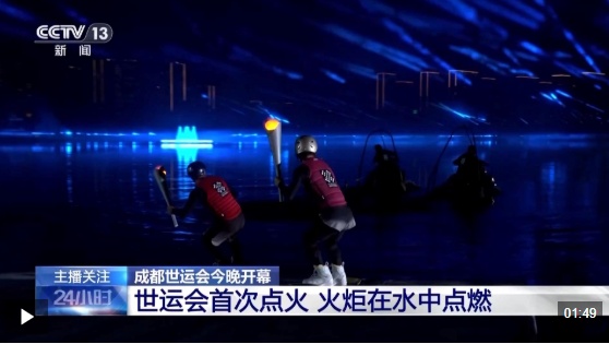 成都世运会开幕式,进行了世运会历史上的首次点火仪式,采用“水中生火”的设计,两名尾波滑水运动员在运动中将水中的火炬点燃,水火交融,寓意“开放”和“融合”。