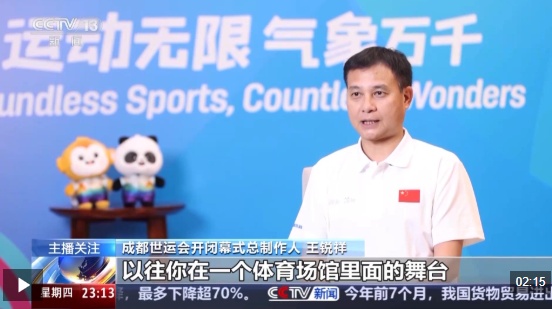 成都世运会开闭幕式总制作人 王锐祥:等于那个舞台是180度。以往在一个体育场馆里面的舞台有聚焦点,但在户外,基本上人所看到的舞台层面,都要表达,所以这个是考验我们导演、舞美、灯光师在聚焦点,怎么把我们的观众拉回这个舞台上。如果没有一个很强烈的细节感受,没有办法把观众的细节拉回中心舞台。