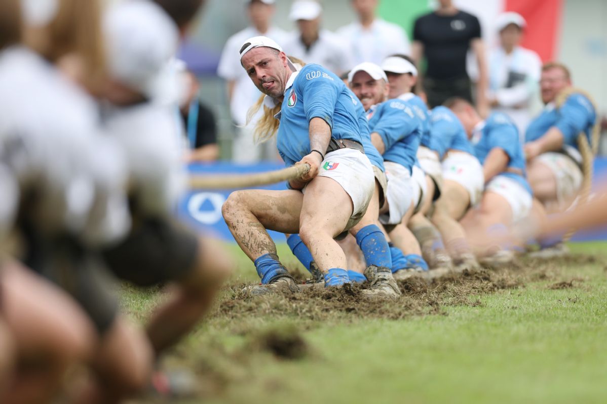 The Italian team contests the bronze-medal match of the 580kg mixed team tug-of-war event at the Chengdu World Games on Monday. The Italians eventually finished fourth, losing to Germany. [Photo by Wei Xiaohao/chinadaily.com.cn]