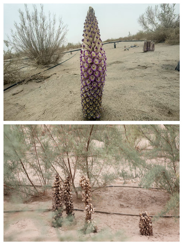 上图为肉苁蓉开花(受访者供图);下图为肉苁蓉开花变干后(摄于2025年6月13日),新华社记者刘诗平 摄