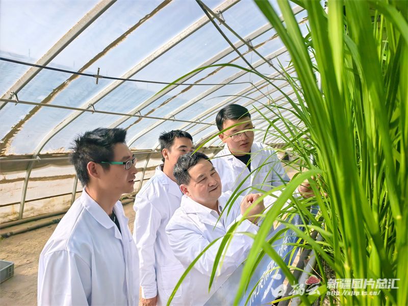 和田地区和田县万亩设施农业基地沙漠温室水稻种植大棚内,中国农业科学院都市农业研究所首席科学家杨其长团队正在查看水稻长势。胡礼政摄
