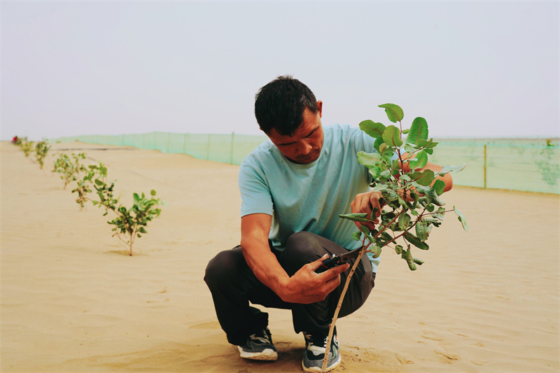 农民正在忙着给开心果苗修剪侧枝。买提努日·买提肉孜 摄