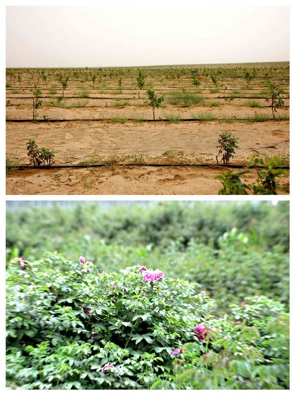 上图为七仙女防沙治沙标杆项目区套种的玫瑰和桃树,下图为七仙女村的玫瑰(摄于2025年6月16日)。新华社记者刘诗平 摄