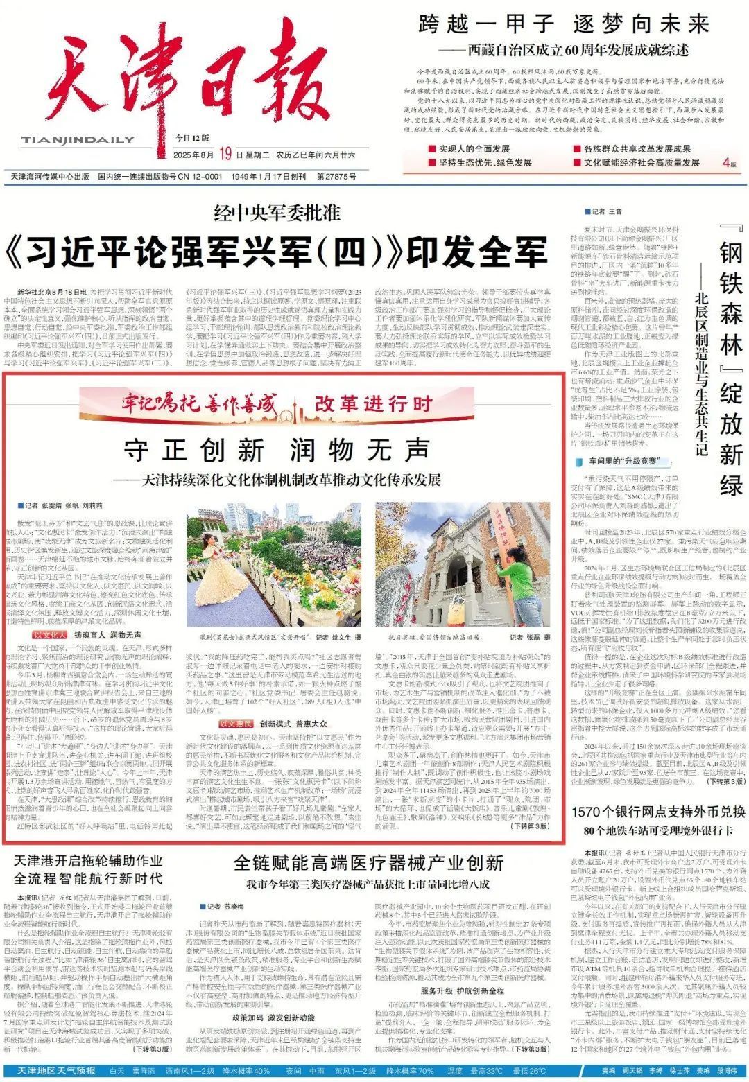 散发“泥土芬芳”和“文艺气息”的思政课,让理论宣讲直抵人心;“文化惠民卡”激发创作活力,“沉浸式演出”构建城市剧场,使“戏聚天津”成为文旅新名片;文物建筑活化利用、历史街区焕发新生,通过文旅深度融合绘就“河海津韵”新画卷……天津绵延不绝的城市文脉,始终奔涌着破立并举、守正创新的文化基因。