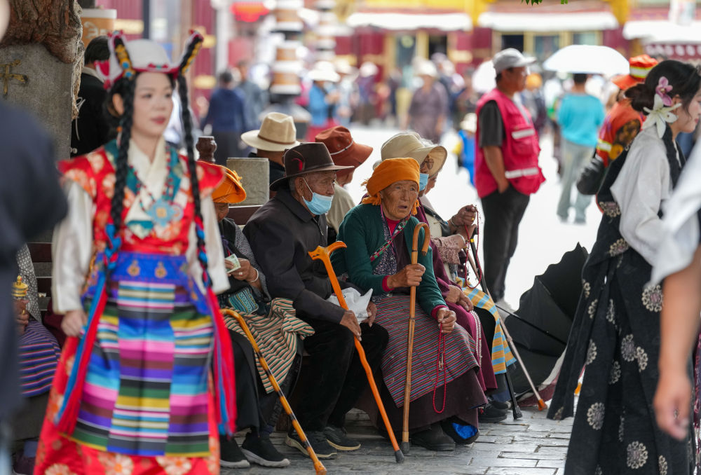 8月19日,本地市民在拉萨老城区休息,前面一名身着藏装的旅客在拍照。新华社记者 晋美多吉 摄