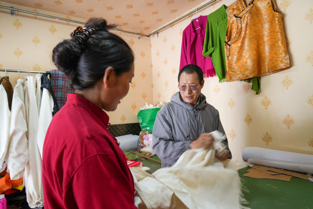 洛桑麦朗(左)在学校和学徒一起查验成品藏装品质(8月15日摄)。新华社记者 晋美多吉 摄