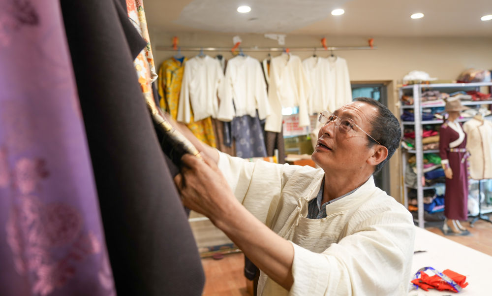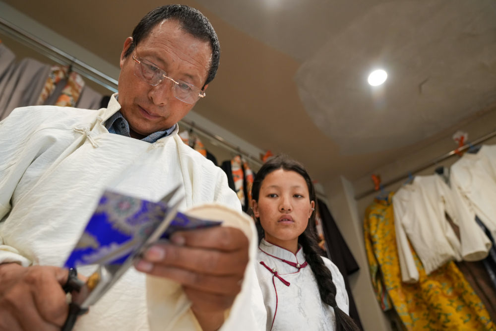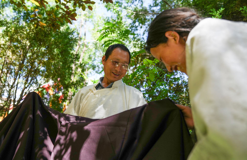洛桑麦朗在检查做好的藏装(8月15日摄)。新华社记者 晋美多吉 摄