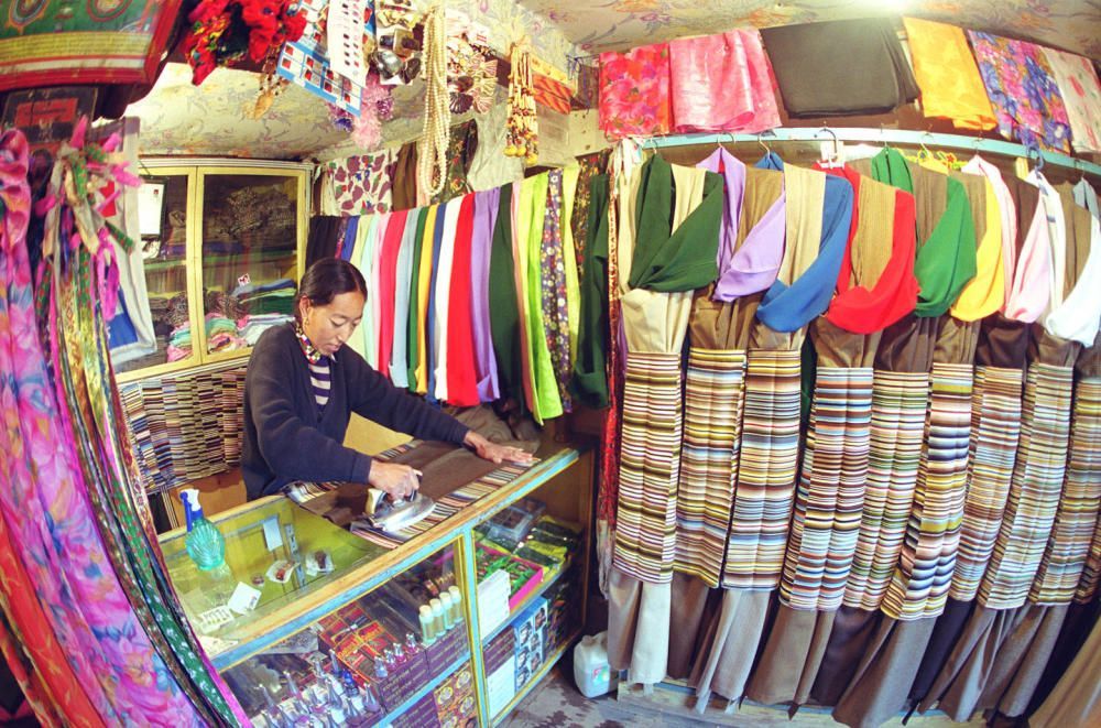 一家藏式服装店的女老板在拉萨八廓街上经营藏装。(2001年2月27日发)新华社记者 王颂 摄