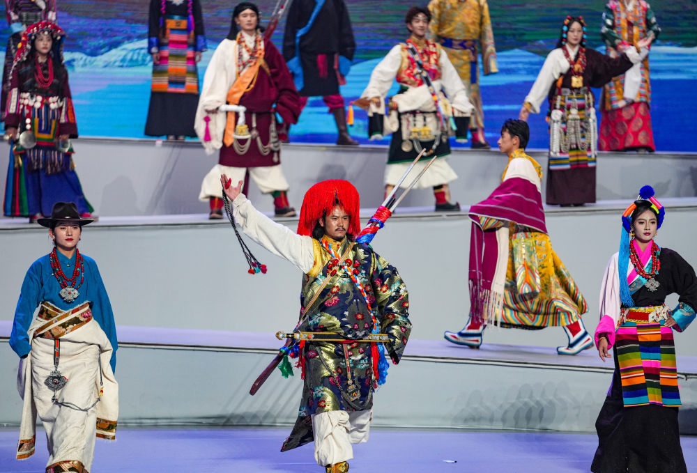 这是1月5日拍摄的首届西藏“衣脉相承”服饰文化周走秀现场上的西藏传统服饰秀。新华社记者 晋美多吉 摄