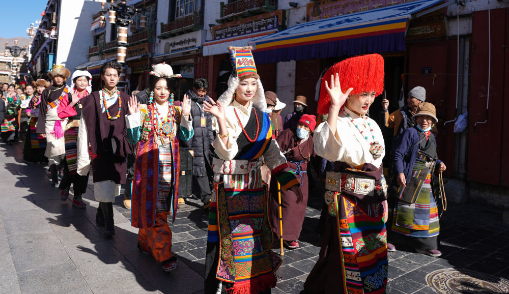 模特在拉萨八廓街举行的“繁饰自然·衣彩拉萨——拉萨新年服饰秀”上巡游(1月3日摄)。新华社记者 晋美多吉 摄