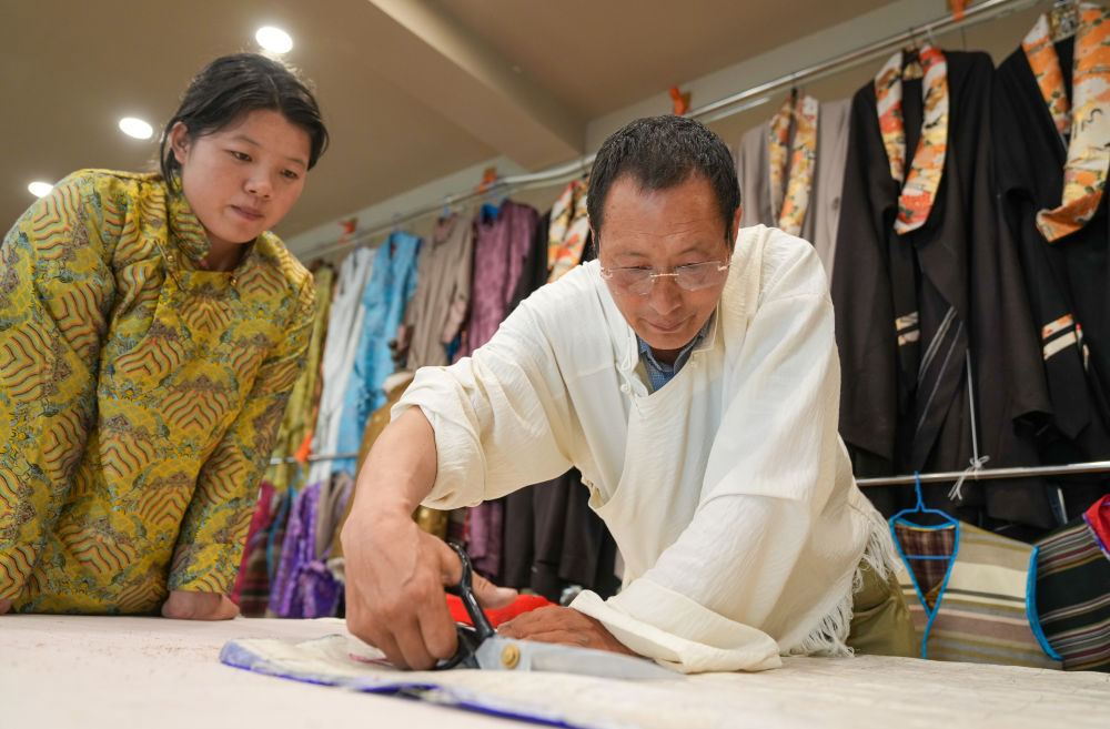 洛桑麦朗(左)在学校指导学徒裁剪布料(8月15日摄)。新华社记者 晋美多吉 摄